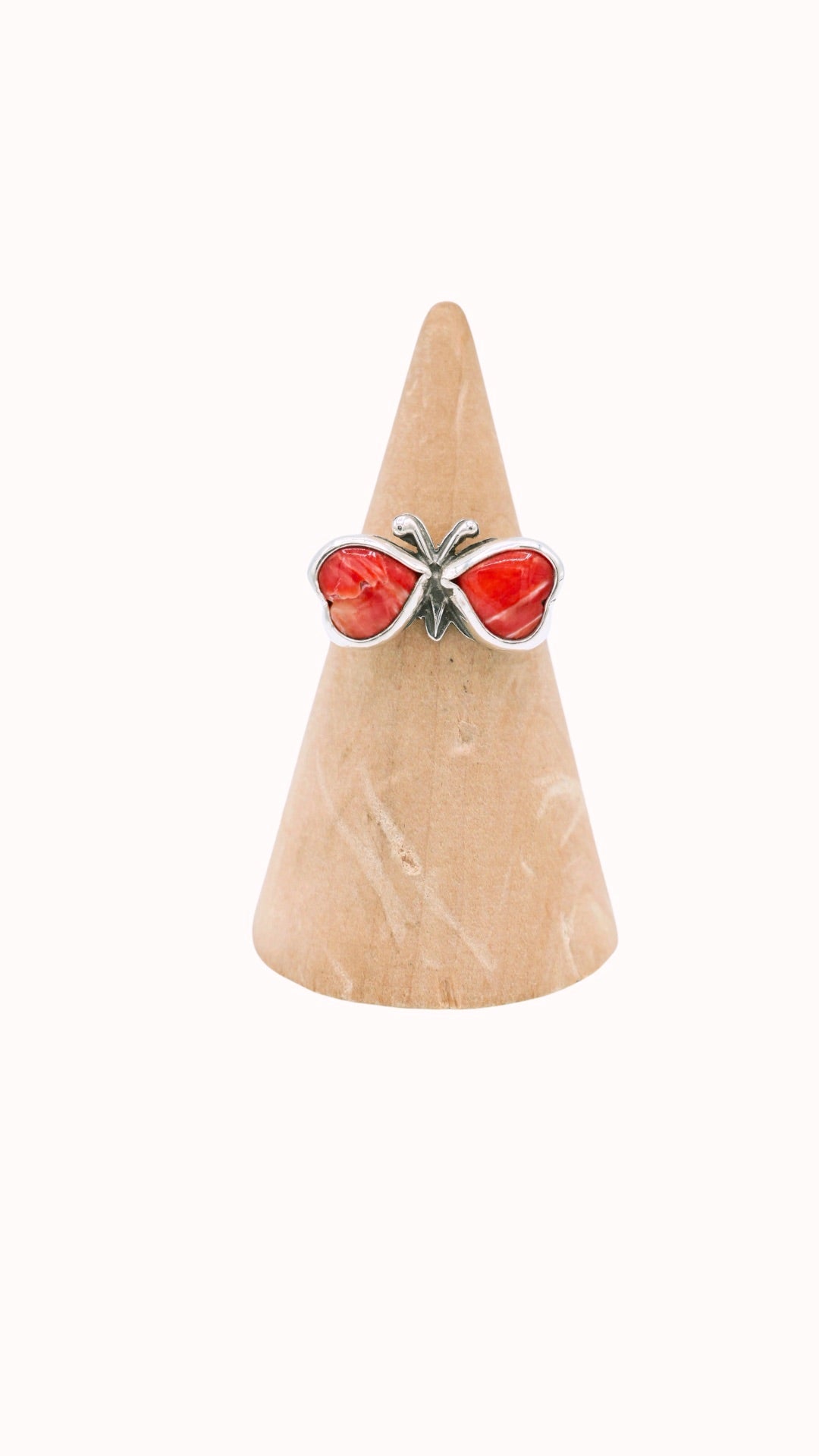 Two heart shaped red spiny oyster cabochons set in sterling silver with detailing to look like a butterfly.