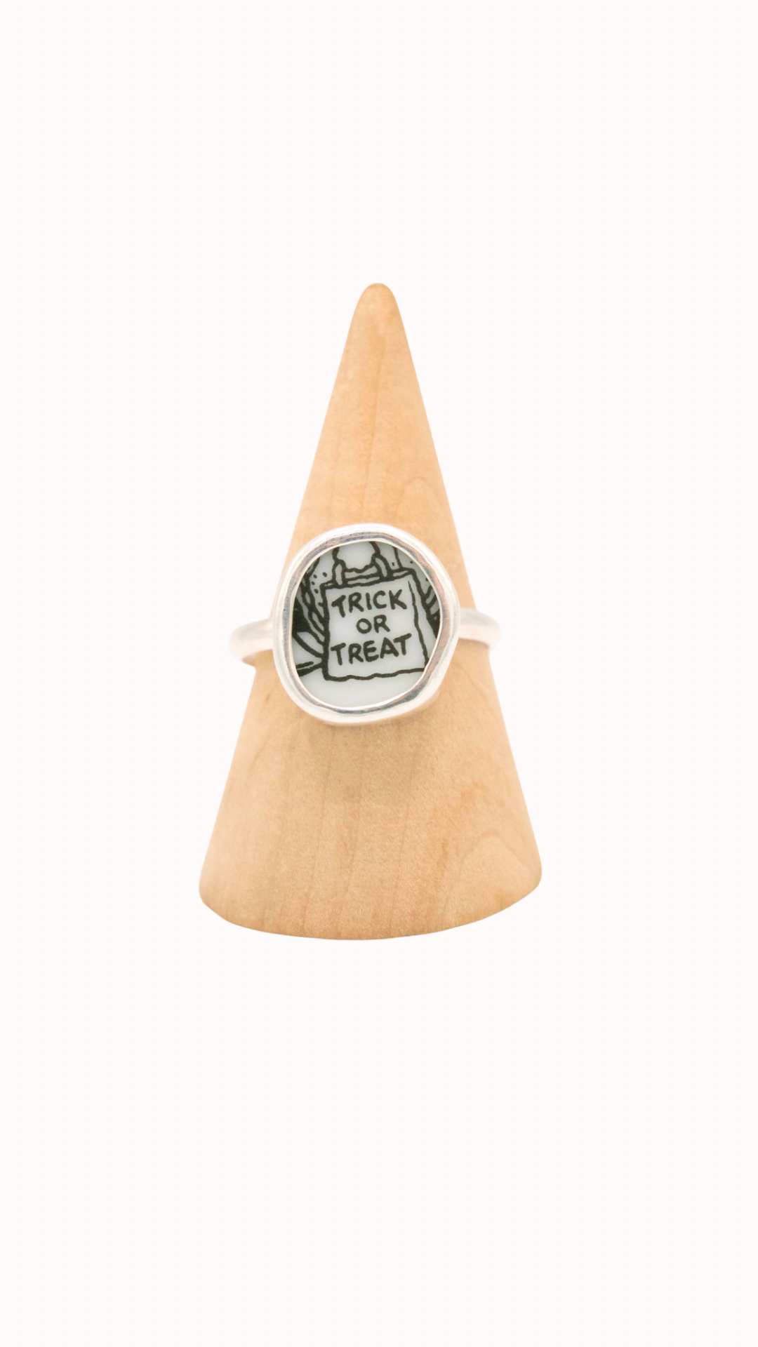 Hand shattered china featuring black and white image of trick or treat bag from Charlie Brown. Set in simple sterling silver bezel on a half-round band.