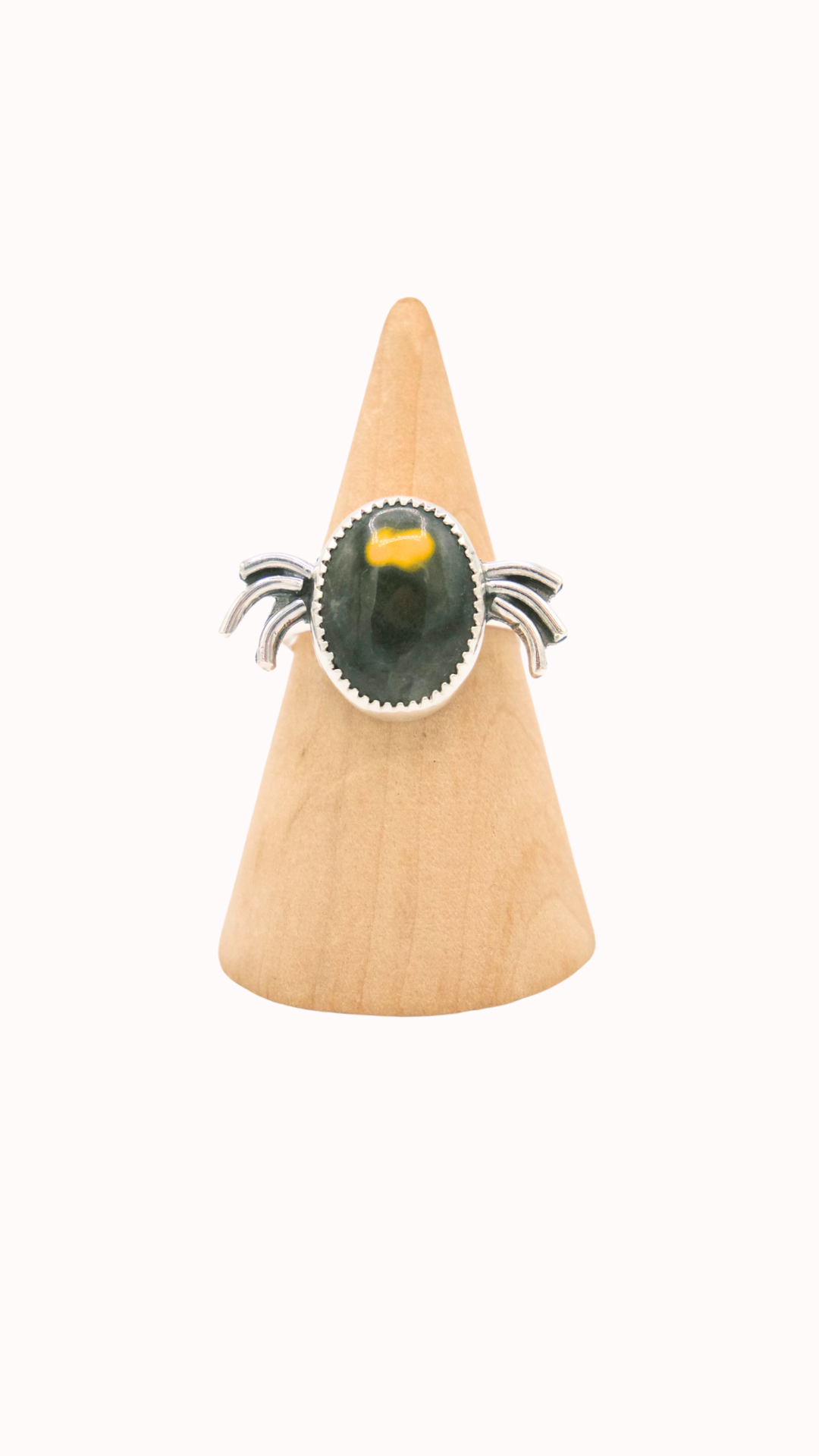Black agate cabochon with orange inclusions set in serrated sterling silver bezel, fabricated with wire legs to look like a spider. Set on half-round band.
