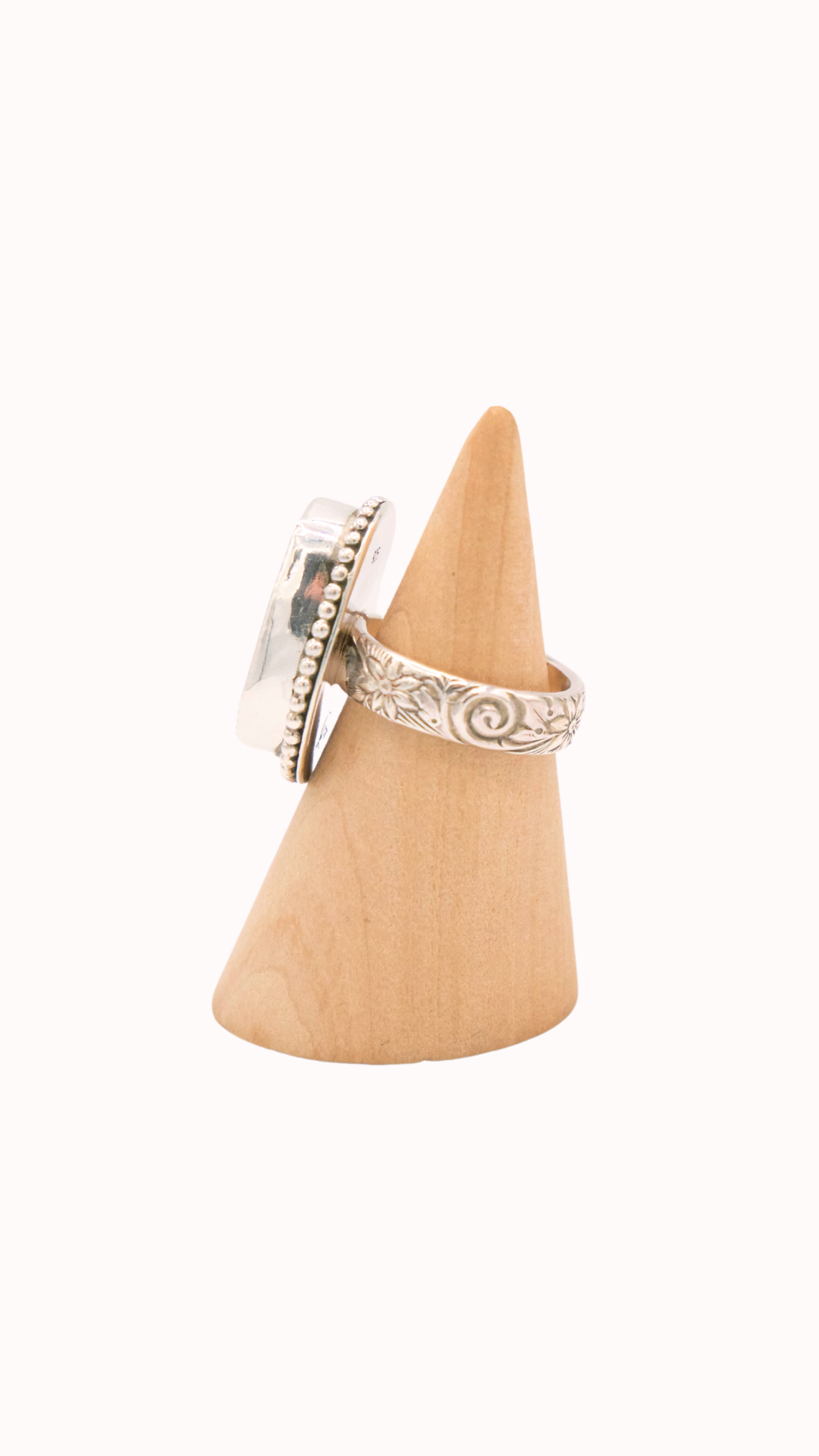 Hand shattered antique china featuring yellow chick and pink flower. Set in serrated Sterling Silver bezel with beaded border on a wide half-round band with floral detailing.