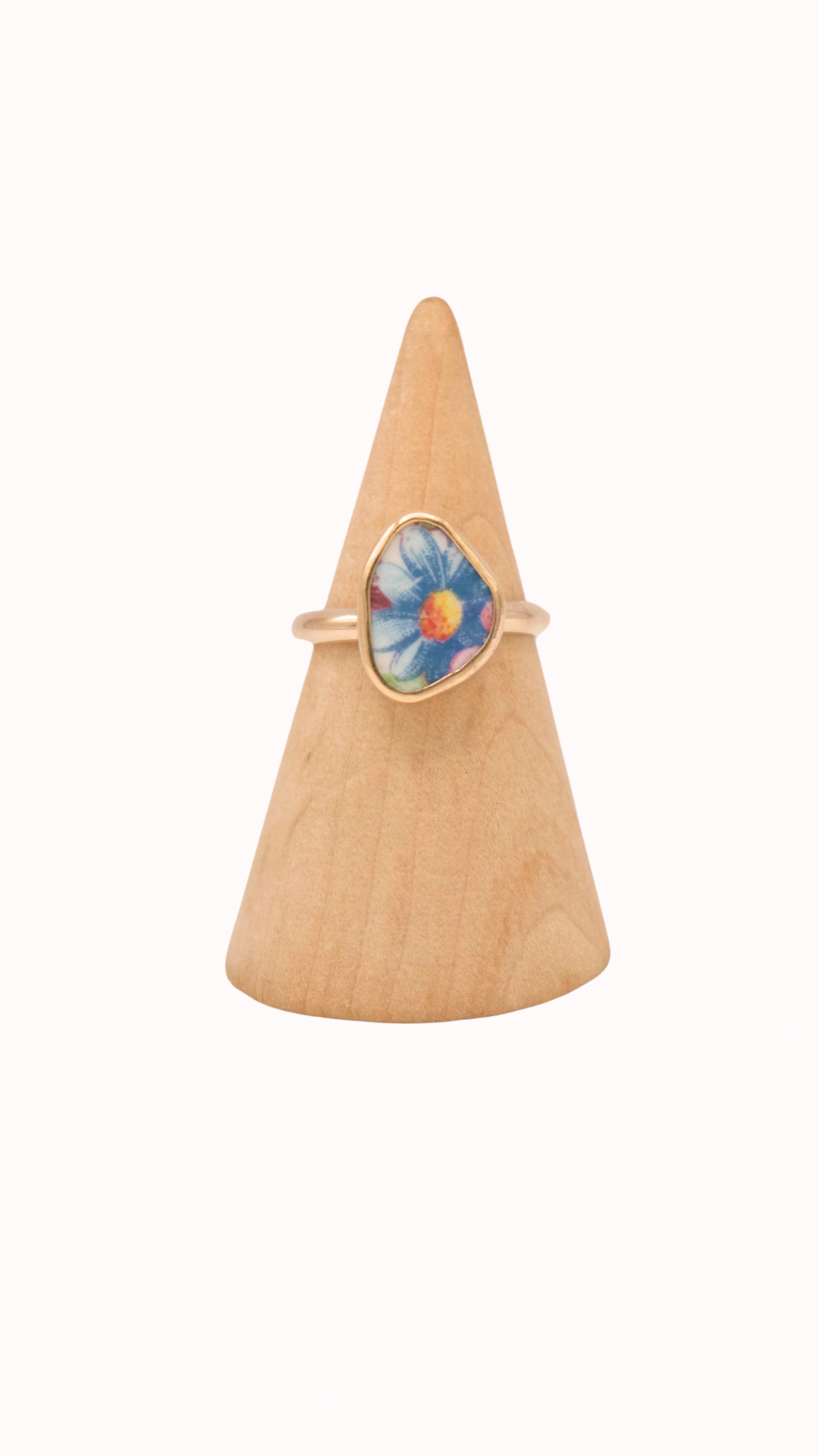 Hand shattered and shaped antique ceramic featuring blue florals, set in gold filled bezel on half round band